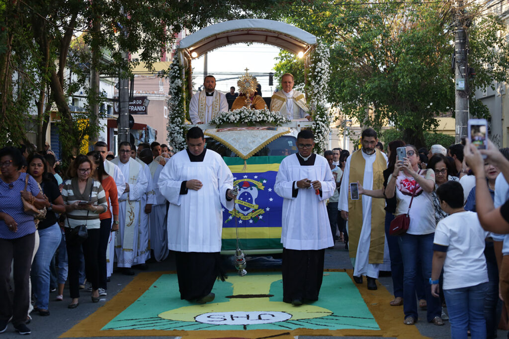 “A instituição da Eucaristia, por Jesus Cristo, se deu na Última Ceia. No calendário religioso, a celebração de Corpus Christi ocorre 60 dias após a Quinta-feira Santa. E, para celebrar a passagem de Jesus Eucarístico, as ruas ganham os tapetes, belas obras de arte, feitas por pessoas de diversas idades, nos emocionando com sua dedicação no ornamento do caminho da procissão”, disse Dom Roberto Francisco.