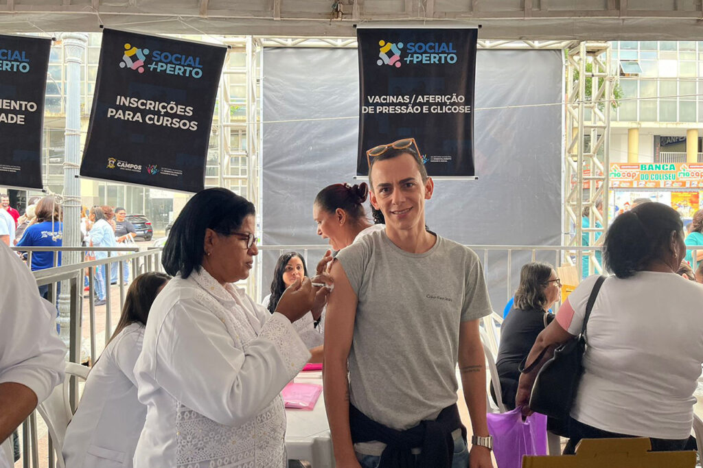 A Secretaria de Saúde esteve mais uma vez no Social + Perto. No evento, a população pode se vacinar contra a Covid-19 e a gripe. O autônomo Leonardo Defante aproveitou que a vacinação estava sendo oferecida para atualizar a imunização. “Eu vim ao Centro resolver pendências quando eu me deparei com a movimentação. É uma iniciativa muito boa, porque em menos de 5 minutos eu me vacinei e saí com a 5ª dose da vacina contra a Covid e também vacinado contra a gripe”, informou.