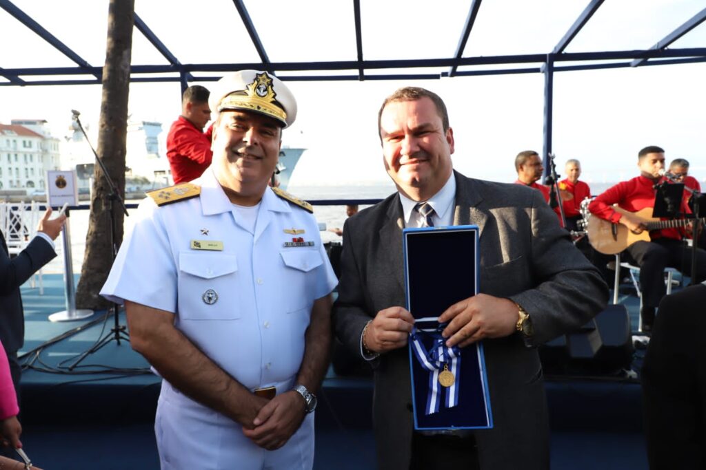 Representando o Poder Legislativo de São João da Barra, o presidente da Câmara, Alan de Grussaí, recebeu, na tarde de ontem (6), a Medalha Amigo da Marinha. A cerimônia de imposição da comenda foi realizada na Ilha Fiscal, no 1° Distrito Naval, no Rio de Janeiro, sendo presidida pelo diretor-geral do Pessoal da Marinha, Almirante de Esquadra, Claudio Henrique Mello de Almeida. A prefeita Carla Caputi também foi homenageada.