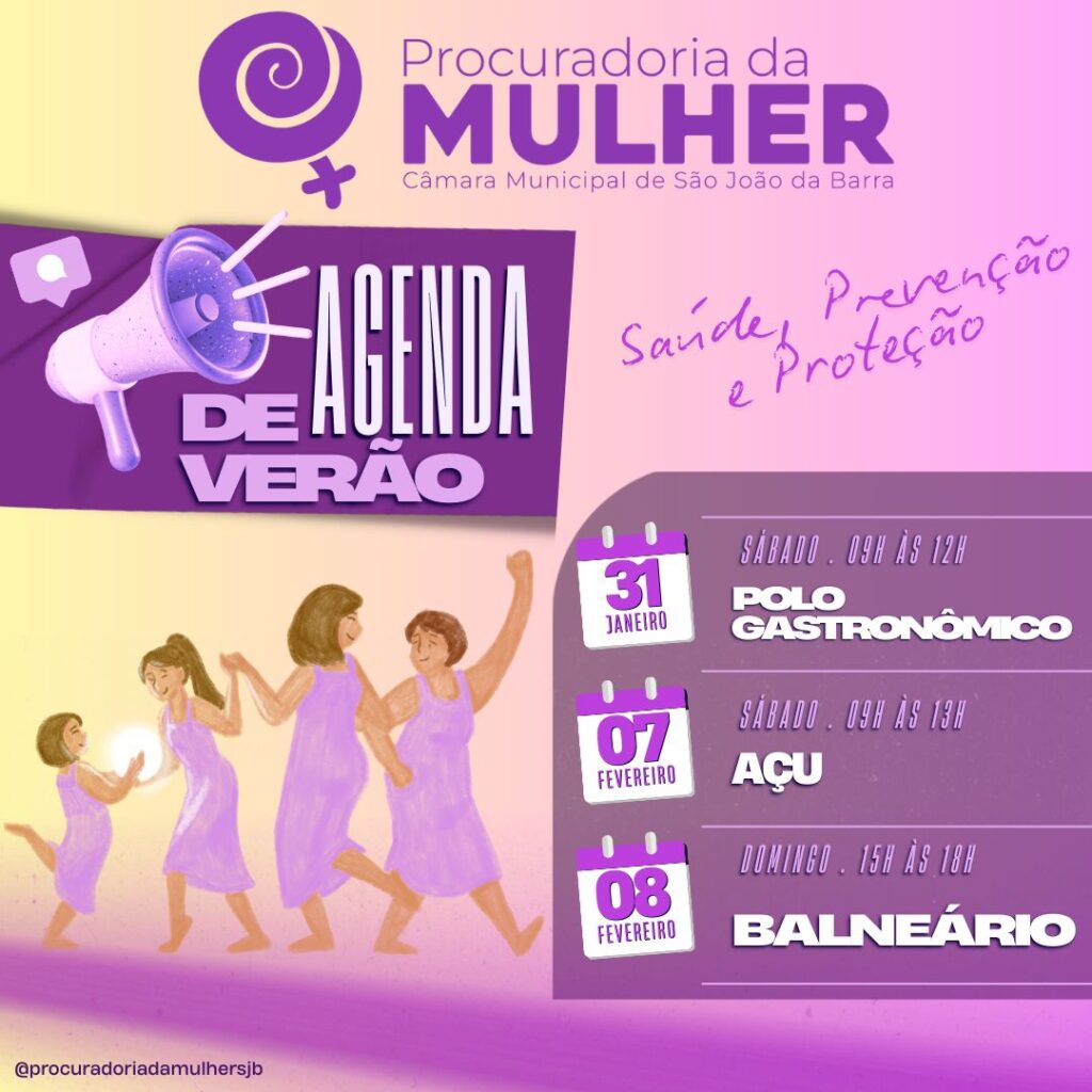 A Procuradoria Especial da Mulher da Câmara de São João da Barra, junto com o Instituto Delas e a Equipe Sofia, vão promover uma programação especial de verão, a partir deste sábado (31), visando à prevenção, saúde e proteção das mulheres. A ação acontecerá das 9h às 12h, no Polo Gastronômico de Grussaí, com testagem de glicose, aferição de pressão arterial, orientação e prevenção contra Infecções Sexualmente Transmissíveis (ISTs).