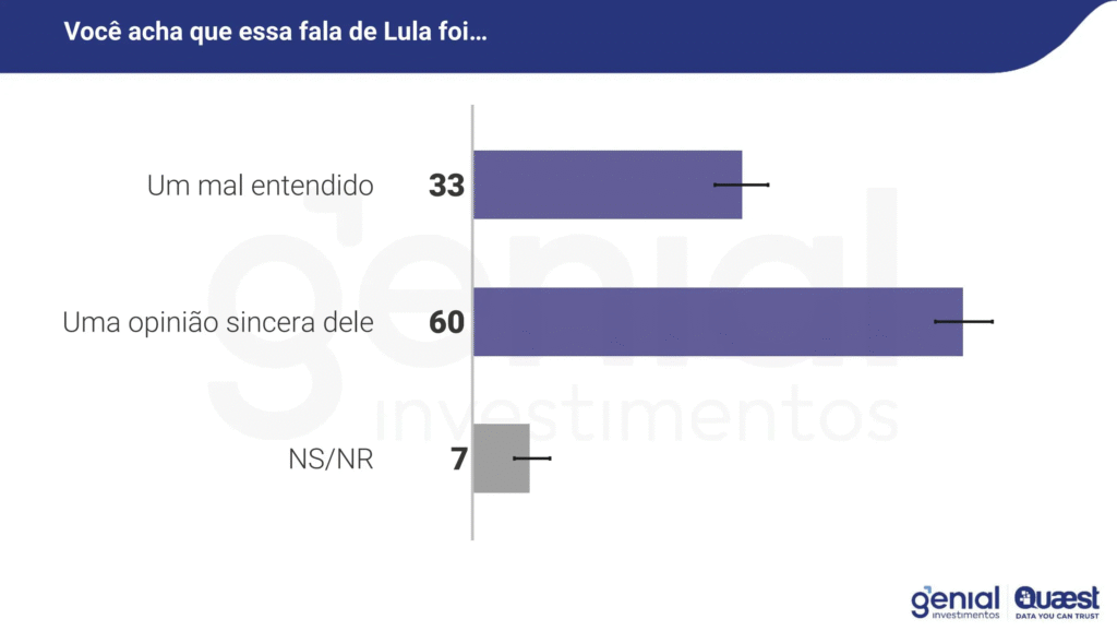 De acordo com pesquisa da Quaest encomendada pela Genial Investimentos, 60% dos fluminenses, porém, acreditam que a fala inicial reflete, de fato, o pensamento de Lula. Para 33%, foi um mal-entendido, e 7% não souberam ou preferiram não responder.
