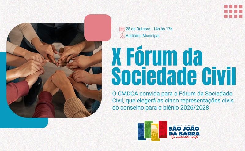 Nesta terça-feira, 28, o X Fórum da Sociedade Civil elege cinco representantes da sociedade civil para o Conselho Municipal de Direitos da Criança e do Adolescente (CMDCA) de São João da Barra. O conselho é órgão paritário com participação da sociedade e do Poder Executivo Municipal. A eleição dos representantes civis acontece das 14h às 17h, no auditório municipal, com diferentes entidades, como associações e sindicatos, entre outros, que representam as crianças e adolescentes.