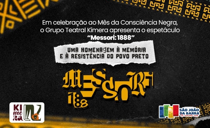Em comemoração ao Mês da Consciência Negra, o Grupo Teatral Kimera com apoio da Prefeitura de São João da Barra, por meio da Secretaria de Cultura, realizará o espetáculo gratuito “Messori: 1888”, na sexta-feira, 21, às 16h, na Praça São João Batista, na sede do município. A peça é inspirada no poema “O Navio Negreiro”, de Castro Alves, e resgata feridas que atravessam séculos e revelam uma realidade que, embora transformada, ainda ecoa nas margens da sociedade.